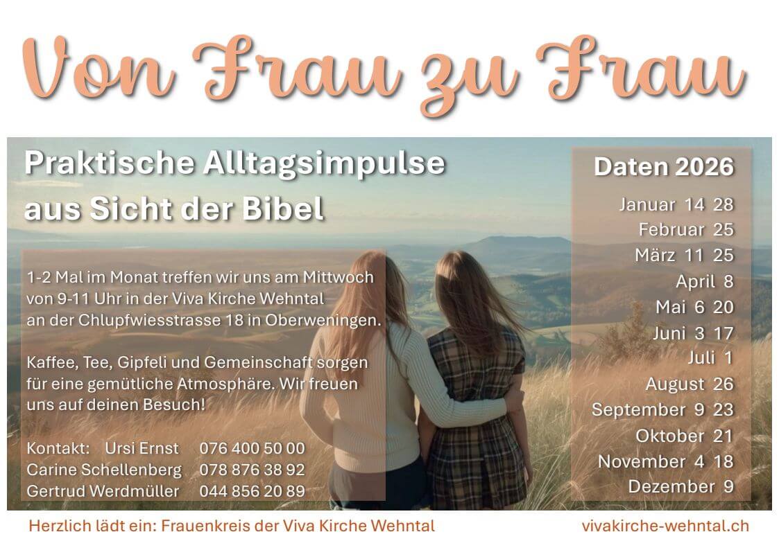 Wir sind eine Gruppe aufgestellter Frauen jeglichen Alters und tauschen uns über verschiedene Themen aus. Ein- bis zweimal pro Monat treffen wir uns am Mittwoch von 9-11 Uhr in der Viva Kirche Wehntal, um bei fröhlicher Stimmung Gemeinschaft zu pflegen und praktische Tipps für den Alltag aus der Sicht der Bibel mitzunehmen. Oft gibt es neue Anregungen, den Glauben an Jesus Christus zu entdecken und im Alltag zu leben. Die Teilnehmerinnen schätzen die offene Atmosphäre. Jede Frau ist herzlich eingeladen, ohne Anmeldung dabei zu sein.